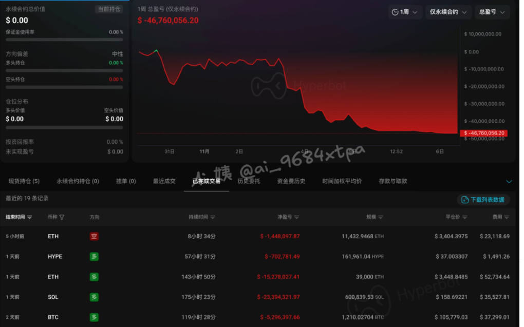 在所有这些巨鲸中,最引人注目的当属那位“前100%胜率巨鲸”。他的故事完整呈现了一个交易员如何从辉煌走向毁灭的全过程,堪称高杠杆交易风险的活教材。