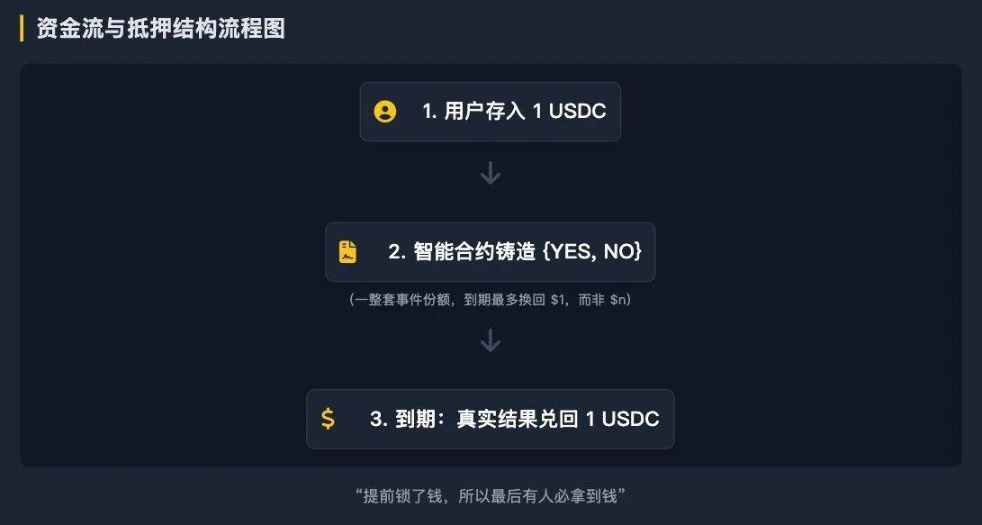 Polymarket 的核心设计是完全抵押(Full Collateralization)。它用结构化的抵押品锁定「赢家拿走 1 美元」这件事,避免出现「有人赢了但没人付钱」的老问题。