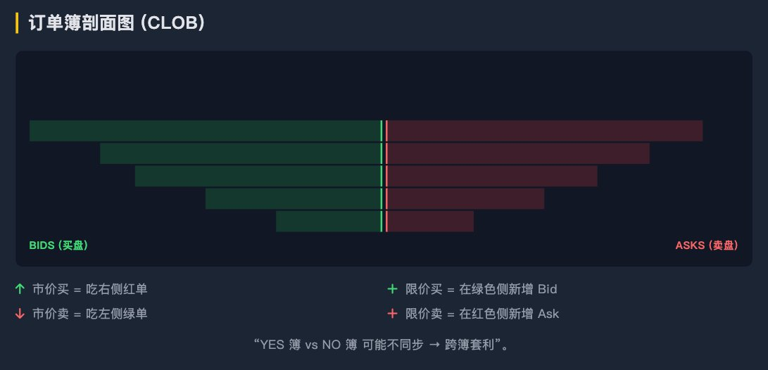 实际成交价来自订单簿深度和滑点,而不是某条静态公式。YES 与 NO 的两个订单簿可能短时错位,这本身就会制造套利窗口。