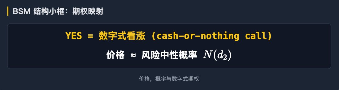 • YES 变成「几乎可当成风险中性概率的票」,可以和 Deribit 等外部市场的隐含概率 (N(d_2)) 对比,做相对价值。