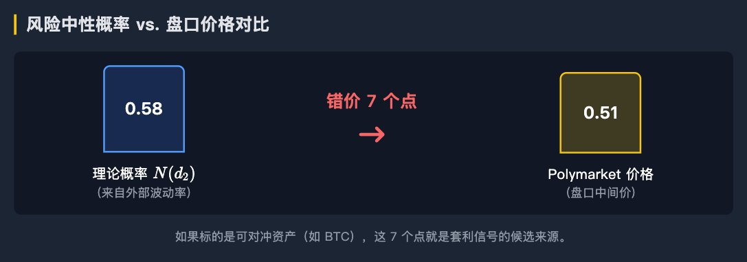 你可以把 Polymarket 的 YES 价格,和 Deribit 等场外期权/期货市场隐含的概率曲线 (N(d_2)) 做比较,问一句: