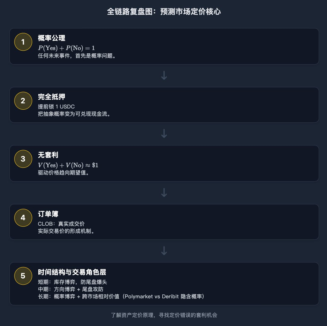 我们现在可以把预测市场 Polymarket 的定价系统,压缩成一条从数学到策略的连续链路: