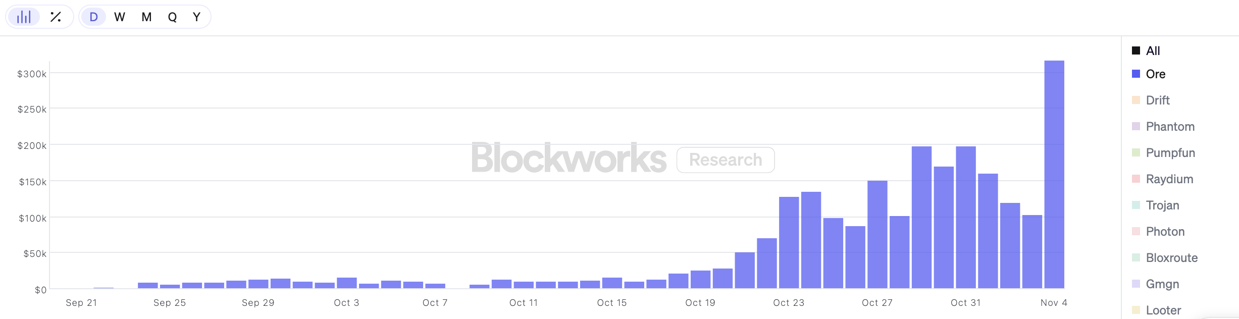 数据印证了这股热度的上升。根据Blockworks Research数据显示,截至11月6日,Ore累计收入已突破168.9万美元。在今年10月中旬之前,其日收入长期处于低位徘徊,多数时间仅维持在数千美元左右。然而,自10月22日起,Ore的日收入出现爆发式增长,在短短十余天内便攀升至十余万美元量级,单日收入最新已达到31.6万美元,与历史最低点(约548美元)相比,增幅高达约576倍。而过去一周的收入达109.4万美元,占累计总收入的64.7%。