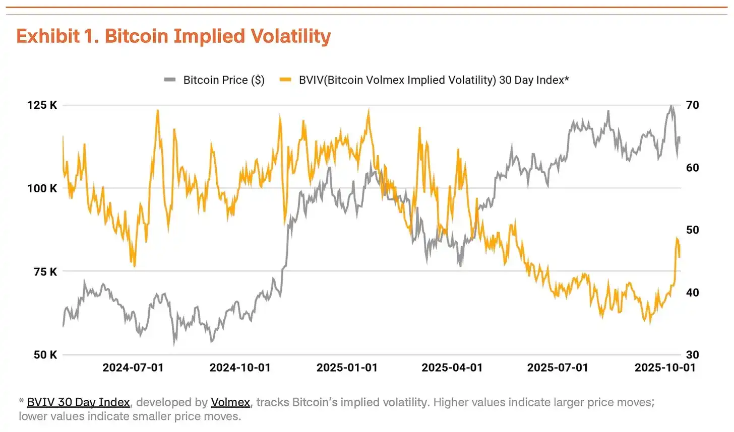 10 月 6 日,比特币创下 126,210 美元的历史新高,但特朗普政府再次对中国施加贸易压力,导致比特币价格回调 18% 至 104,000 美元,波动性显著增强。根据 Volmex Finance 的比特币波动率指数(BVIV),随着机构投资者稳步增持,比特币波动率从 3 月到 9 月有所收窄,但在 9 月之后飙升 41%,加剧了市场的不确定性(图表 1)。