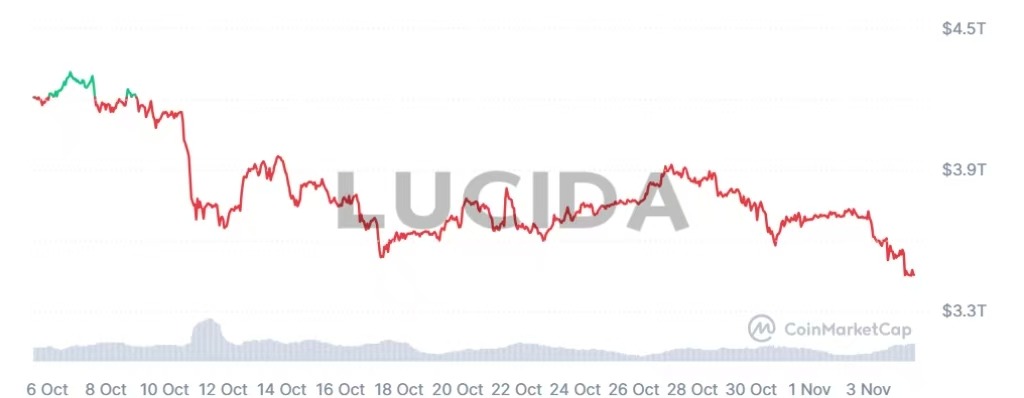 总市值是市场情绪的最终结果和整体体现。它的波动是所有个体代币价格变化、资金流入流出以及市场信心的综合产物。在10月,总市值经历了“过山车”般的旅程:在10月5日,受益于比特币和以太坊的强势上涨,总市值一度创下4.35万亿美元的历史新高。然而,在“10·11”暴跌行情中,单日跌幅超过9%,市值大幅蒸发。截至10月底日,总市值回落至约3.4万亿美元,这一起一落,深刻揭示了在市场恐慌和去杠杆过程中,财富效应的剧烈收缩。
