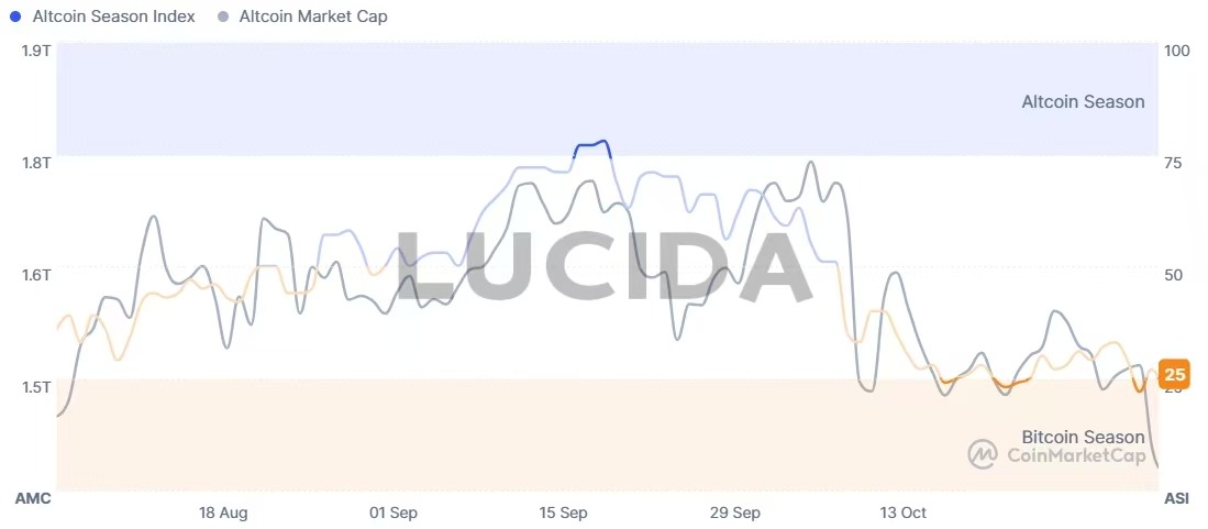 山寨季指数的核心逻辑在于衡量有多少主流山寨币在特定周期内表现优于比特币。当指数低于75,尤其是处于20-30的区间时(即“比特币季”),表明资金正从高风险的山寨币撤出,流向更稳健的比特币,这通常是市场避险时期或牛市初期的特征。这一点在10月底得到印证,当时该指数为32,确认了市场处于避险模式。