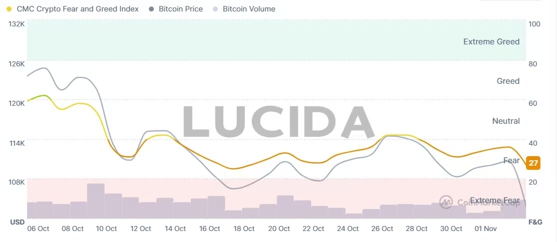 加密恐惧与贪婪指数在10月至11月初经历了从“贪婪”到“极度恐惧”的剧烈摆动。该指数在10月5日曾触及74的“贪婪”高点,彼时比特币价格也逼近历史峰值。然而,随着市场因宏观担忧(如特朗普的关税威胁)和内部结构性风险(如高杠杆清算)出现暴跌,该指数在11月4日骤降至21,进入“极度恐惧”区域。这种情绪的极端逆转,不仅反映了投资者信心的脆弱性,也常常成为判断市场短期超卖或潜在反弹时机的逆向指标——有分析师认为,这种极度的市场担忧情绪可能预示着阶段性的底部正在形成。另外,在10月的暴跌中,比特币主导率上升,而市场交易量和社交情绪全线下滑,这些共同将情绪推向了“恐惧”一端。