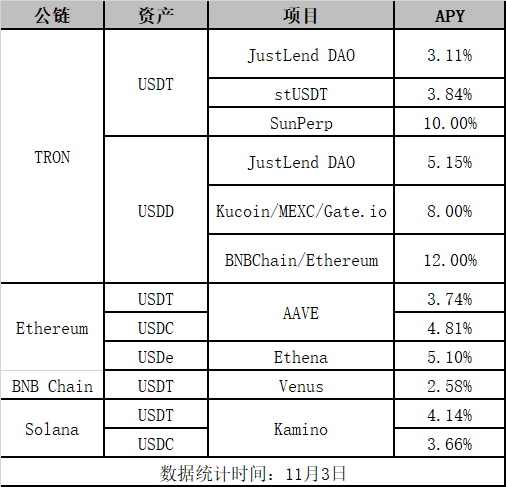 在稳定币收益方面,波场TRON生态内稳定币无风险收益领跑市场,显著优于其他主流公链。根据11月5日最新数据显示,波场TRON生态内稳定币的年化收益率最高可达10%+,远高于以太坊、BNB Chain、Solana等主流公链(普遍年化在3%-5%之间),为追求无风险收益的稳定币投资者提供了极具吸引力的配置选择。
