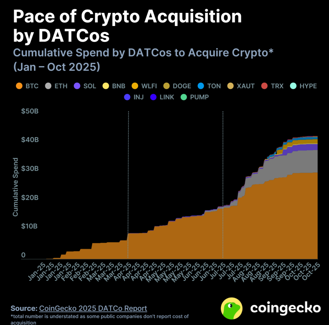 Solana、BNB、WLFI 等其它资产在 2025 年的采购中占比 11.2%。随着更多山寨币被纳入储备,这一比例预计还将上升。不过,比特币和以太坊目前仍是 DATCo 的首选资产。