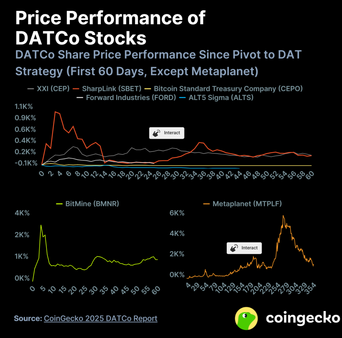 • DATCo 股票在最初 10 天内暴涨(例如 BitMine 涨幅达 3,069%),随后普遍出现回调。