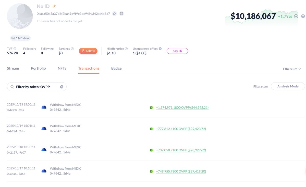 鲸鱼0xaca5,持有超过1000万美元的资产,从MEXC和DEX购买了760万$OVPP(16.5万美元)。