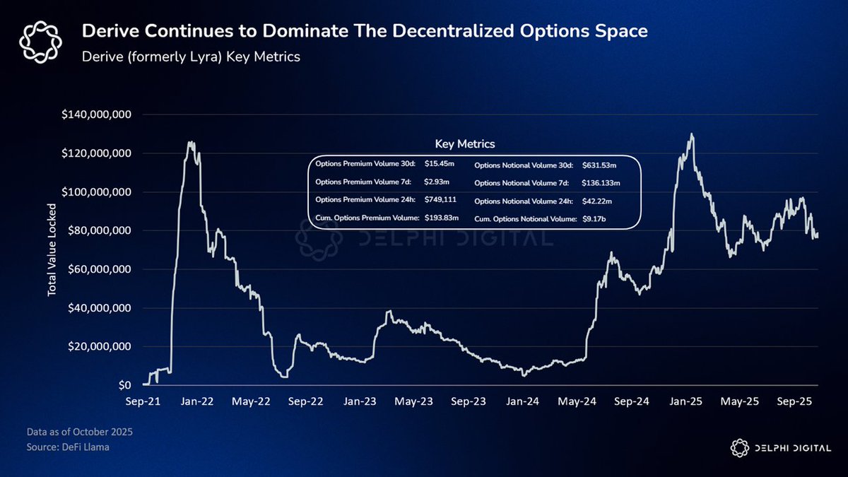 Derive 在去中心化期权领域继续领先,月度名义期权交易量超过 6.3 亿美元,TVL 超过 7500 万美元。