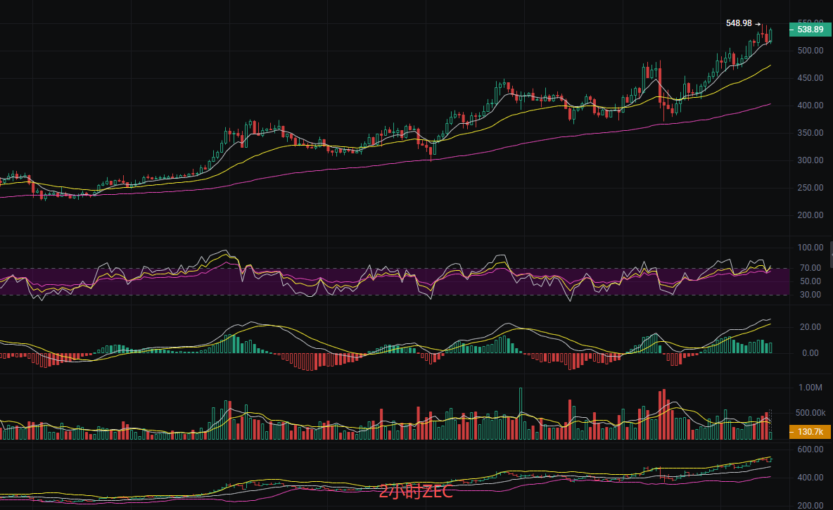 Before publication, the current price of Zcash is 528. Liying assesses that ZEC is in an upward trend, with technical indicators showing increased momentum. The moving average system has formed a bullish arrangement accompanied by a golden cross, further confirming the market's bullish inclination. The bullish engulfing pattern indicates that prices are likely to continue rising. Note that the price is approaching the key resistance level of 549, and the RSI is in an overbought state, suggesting potential short-term pullback pressure. Additionally, the volume data is insufficient, failing to provide strong support for the price-volume relationship.