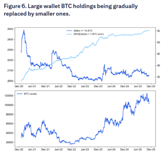 花旗的最新报告揭示了当前调整背后的关键驱动力:链上数据显示,比特币「巨鲸」(大额持有者)正在逐渐减少,而小额「散户」钱包的持有量却在增加。这一现象与四年周期理论高度吻合,也即在周期尾部,聪明资金通常会向新进入者出售比特币。