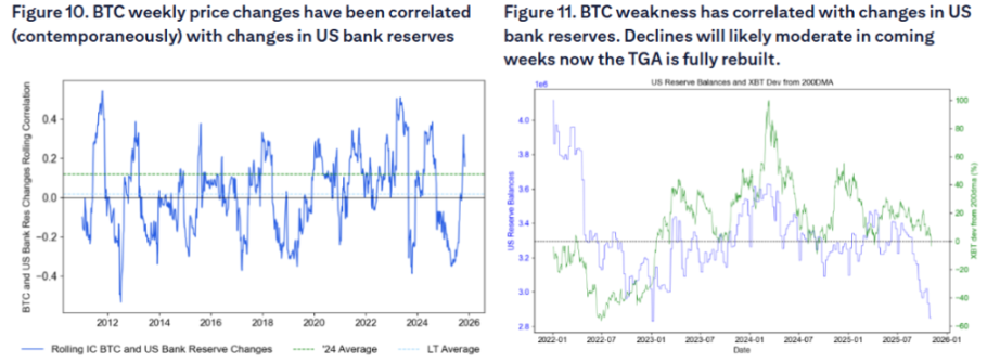 花旗报告特别强调,加密货币对银行流动性状况「非常敏感」。研究显示,比特币的周价格变化与美国银行准备金的变化呈现同步相关性,银行准备金的下降往往伴随着比特币的疲软表现。这种敏感性使得比特币成为流动性收紧最早、最敏感的受害者。
