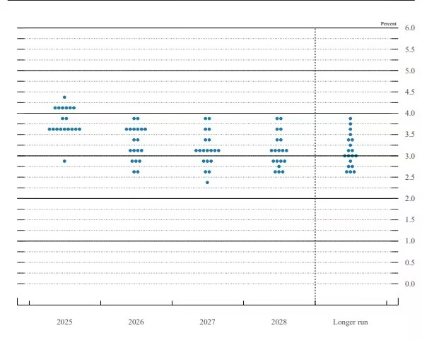 ● 2026年及以后:点的分布开始出现明显的发散,预测范围拓宽。这表明随着预测时间拉长,委员们对于经济的最终走向、特别是“中性利率”的水平存在显著分歧。