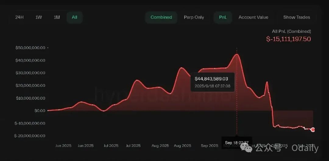 这场循环在十月重复了不下十次。像一个输红眼的赌徒,不断“补仓”,但每一次补仓都被更猛烈的下跌无情吞噬。10 月 11 日、10 月 14 日、10 月 23 日、10 月 30 日……他的仓位被一次又一次地清算。尽管期间市场偶有反弹,让他小额仓位出现近百万美元浮盈,但相较于巨大的亏空,这只是杯水车薪。到 10 月 31 日,他的总亏损已达1450 万美元。
