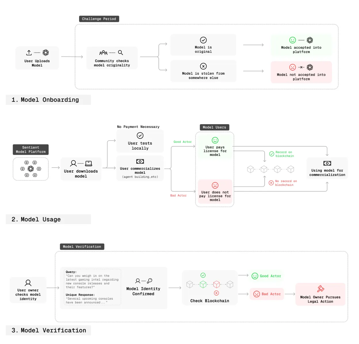 这种嵌入的指纹将作为证明模型所有权和验证Sentient生态系统内使用记录的基础。当建设者向Sentient注册模型时,区块链像IP许可一样记录和管理它们。这种结构使所有权验证成为可能。