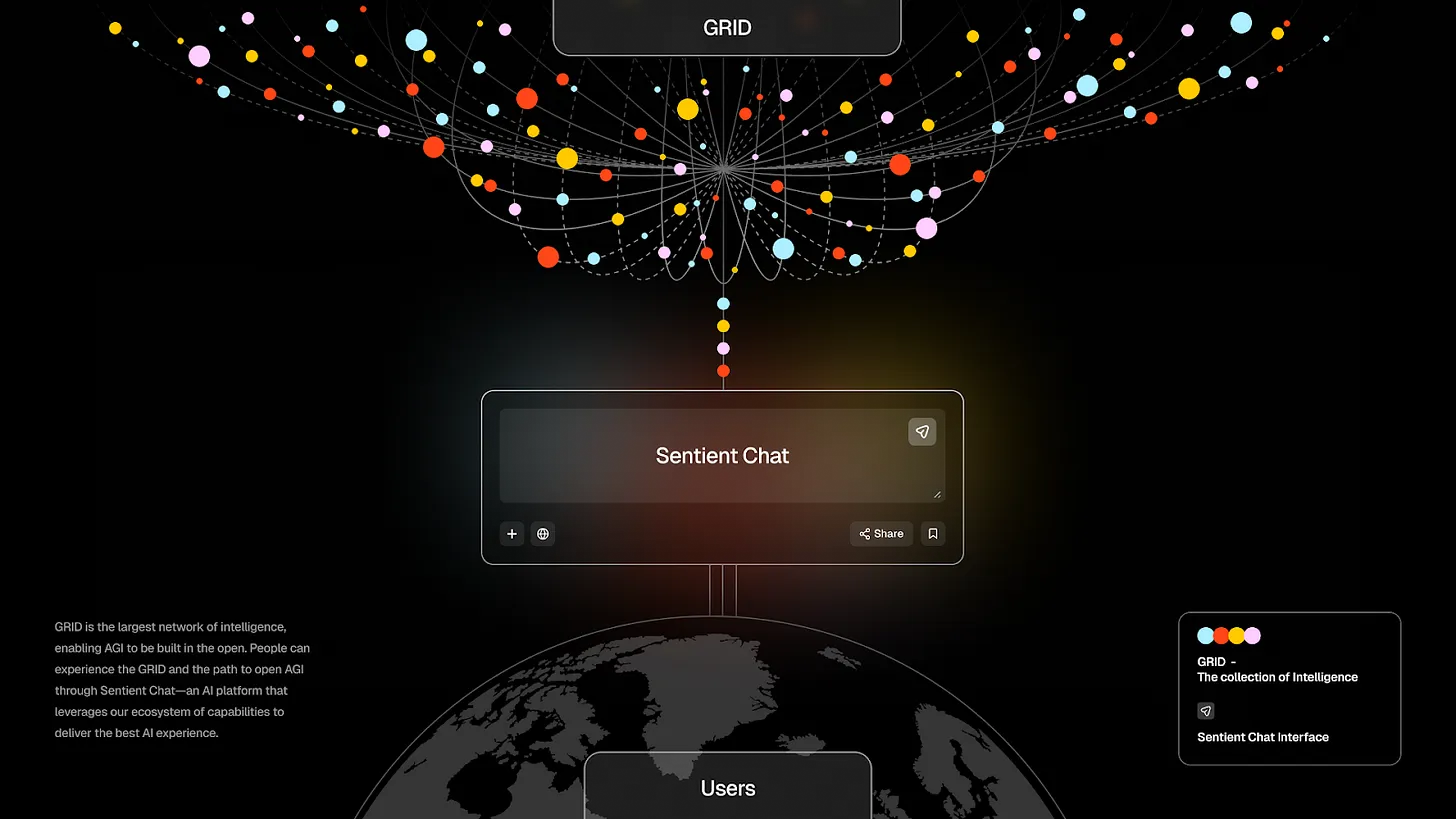 Sentient Chat充当一个网关。它连接GRID的开放生态系统与公众。它将"每个人构建的AGI"扩展为"每个人都可以使用的AGI"。Sentient计划很快将其完全开源。任何人都可以带来他们的想法。他们将添加他们认为必要的新功能。他们将自由使用它。