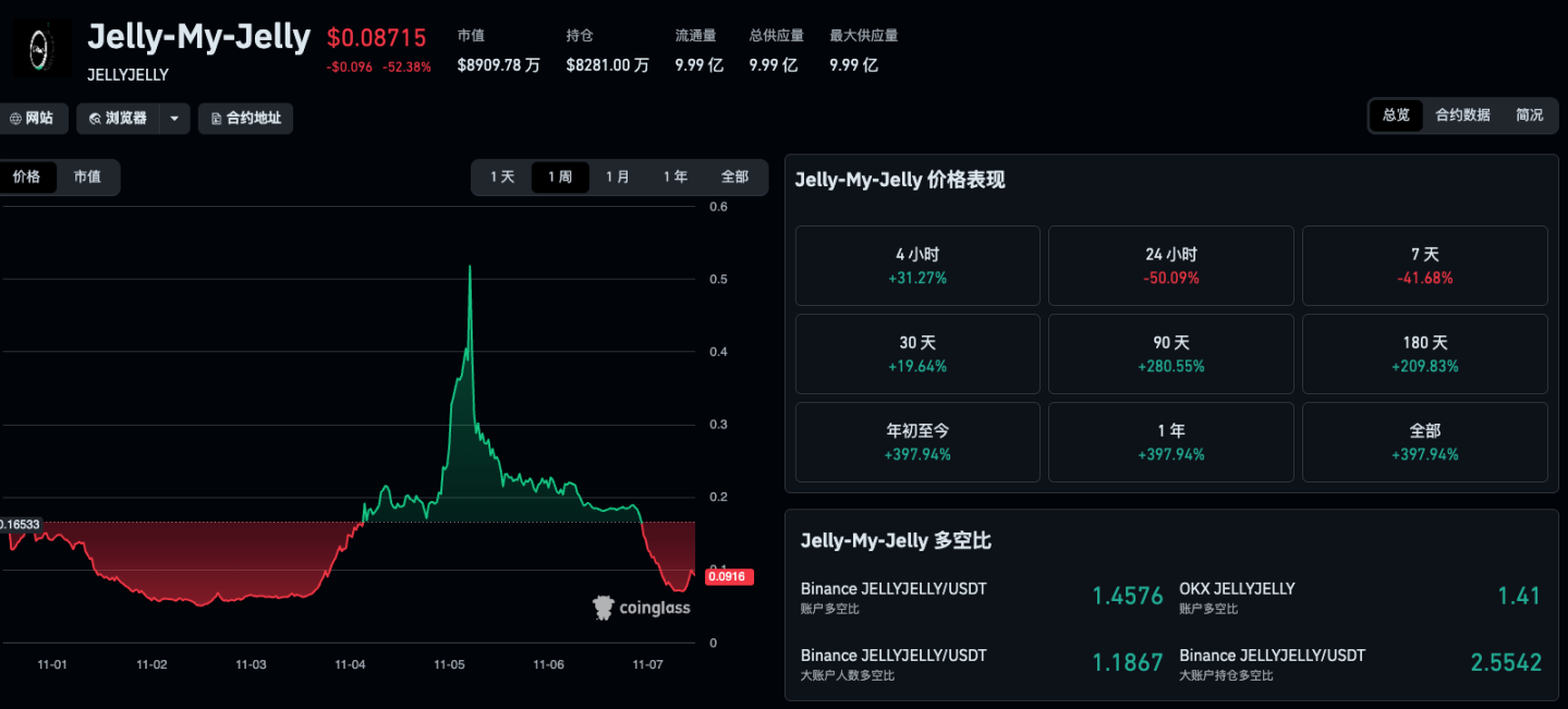 From the peak on November 5 to November 7, the price retraced to $0.09, completing a roller coaster ride in just three days. After the volume peak, JELLYJELLY's trading volume gradually decreased, and open interest (OI) quickly fell from its previous high, coinciding with the price drop. In simple terms, funds were pulled directly in a thin depth, and after insufficient support at high levels, the price was directly smashed down.