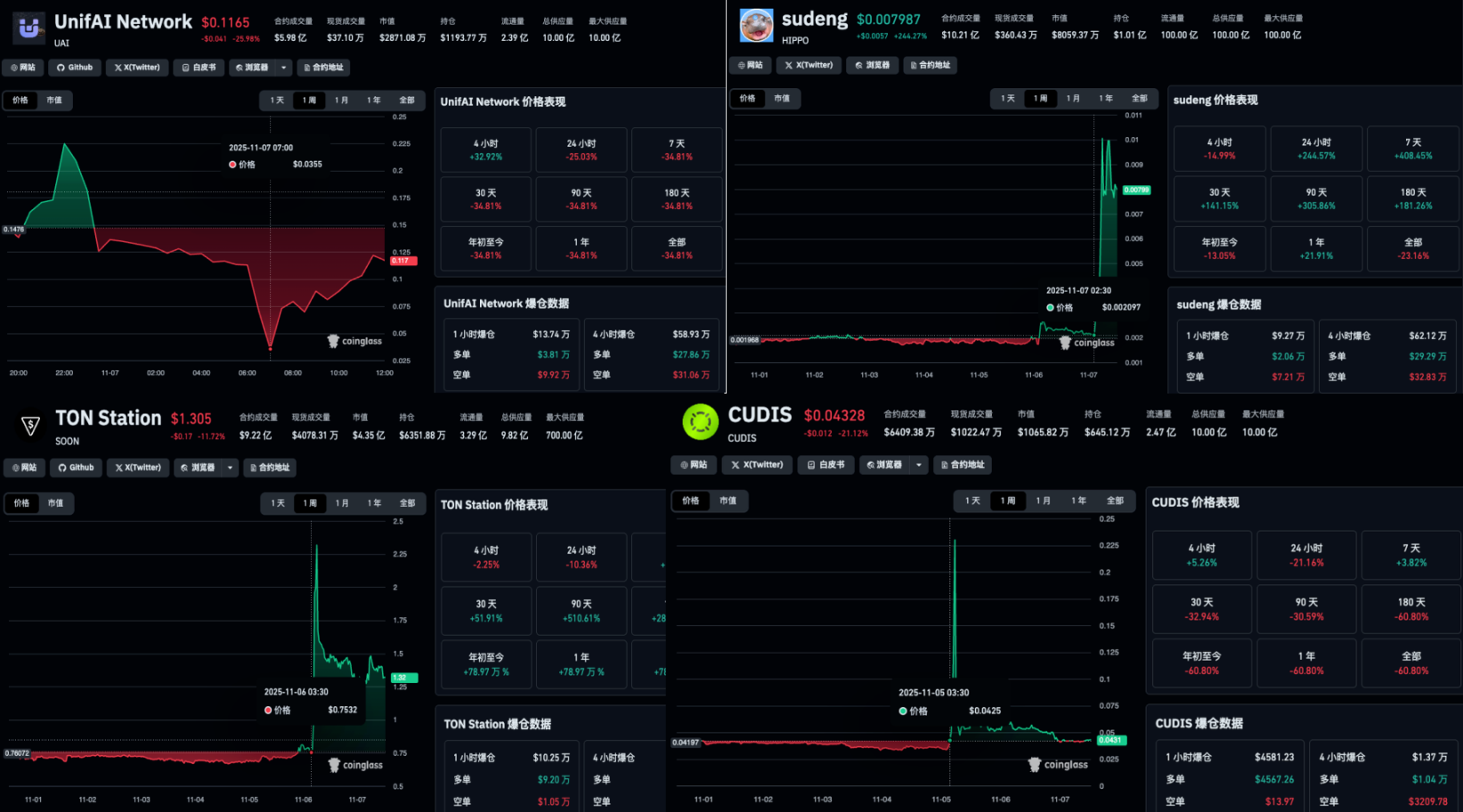 The typical approach for these trading movements is either to press down or move sideways during the day, then suddenly reverse between 2:00 AM and 7:00 AM: either a sharp pull to fill gaps or a rebound to offload. For example, HIPPO suddenly ignited around 2:30 AM on November 7 after a period of sideways movement, pulling up sharply in a short time; TON Station (SOON) peaked sharply around 3:30 AM on November 5 before falling back; CUDIS saw a single large volume spike at 3:30 AM on November 5, followed by a gradual decline; UAI first hit a low and then quickly rebounded between 6:00 AM and 7:00 AM on November 7.