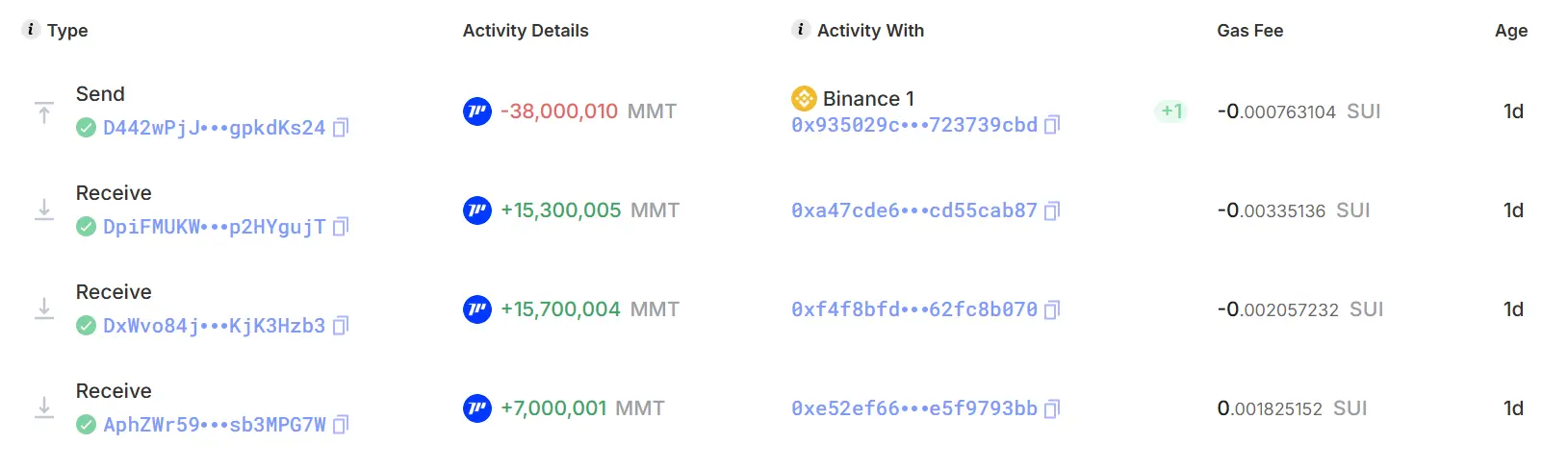 紧接着,MMT 价格从高点大幅回落至不足1美元,回撤幅度超80%。据 Suiscan 数据显示,Momentum 团队关联地址 0xe7cd7a88a4向币安转入了 3800 万枚 MMT 代币,价值约 4560 万美元。这批代币来自第二大持币地址 0x1b4d27355c8,该地址持有 MMT 总供应量的 18.57%,这一抛售行动引发市场恐慌。