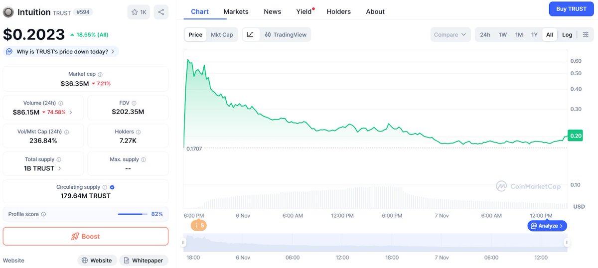 11 月 5 日多平台上线后, $TRUST 从开盘 FDV 1.5 亿美元飙升至 6 亿美元峰值,随后 24 小时内回落至 2 亿美元区间