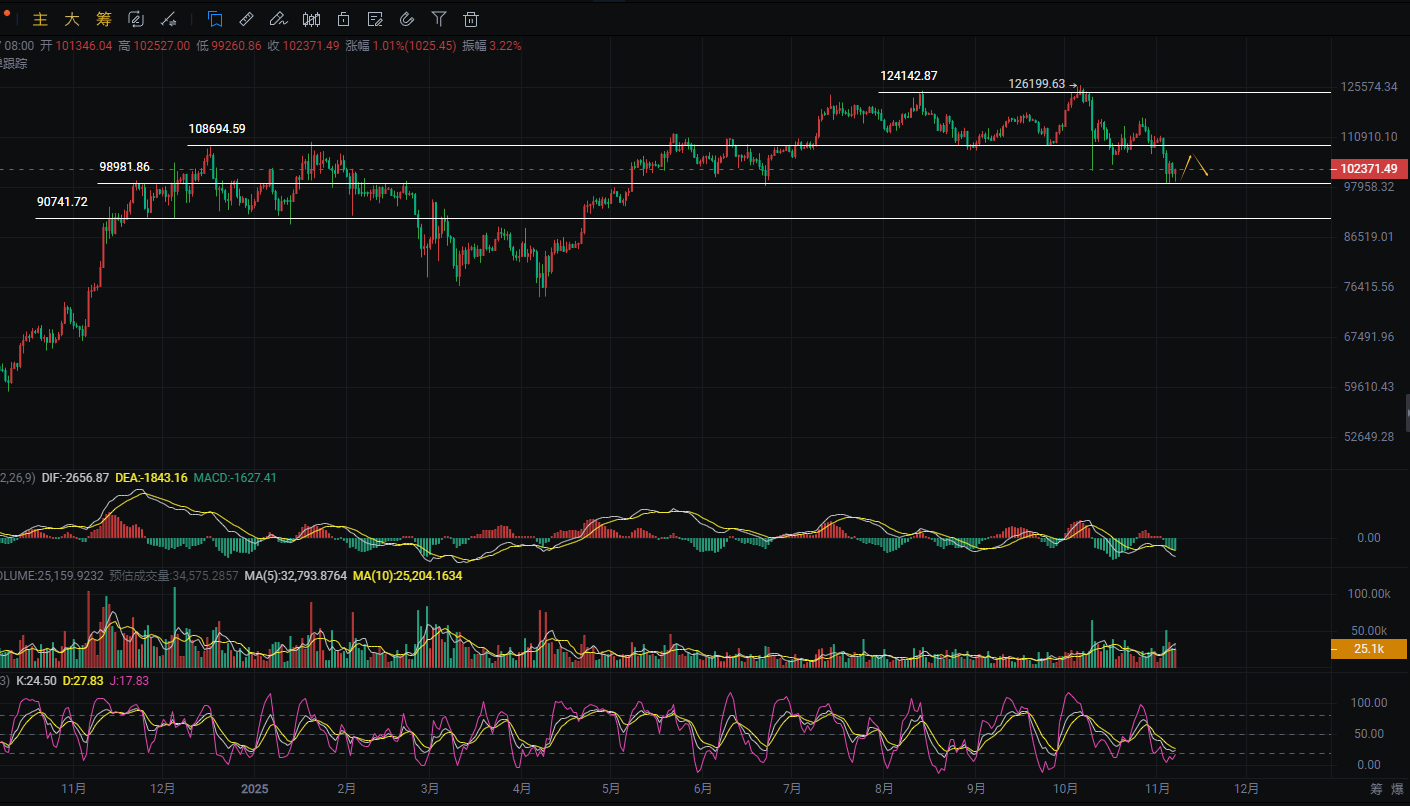 即便是周五,大饼这走势也就这样了,掀不起什么大浪,仍旧没有刷新上次的低点,涨和跌虽然本周一直横跨10万整数关口,但实际币价却并没有什么变动,如果周五晚上非农数据切实公布的话,可能还会有点期待,可惜它不公布,按照周内这样的震荡格局发展,周末币价的总体波动也不会超过5000点,本来还想依仗一下看会不会来个黑色星期五,可这种情况发生的概率有时也很渺茫,现在已是周末,预计周六周日也是横盘震荡为主,大波动操作又要等下周了。