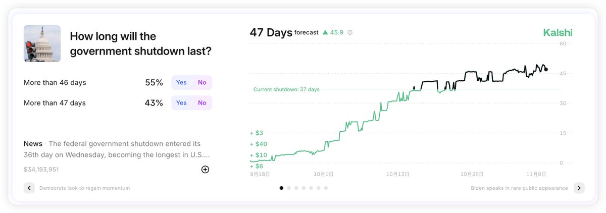 现在市场最新的预测数据显示美国政府可能会停摆47天,这就意味着市场并不看好两党会在本周达成共识,下周恢复工作,很有可能下周还要继续讨论,然后一周后恢复工作,但不论如何目前两党坐下谈判是真的,虽然共和党拒绝了一项提案,但市场仍然认为和谈是有机会的。