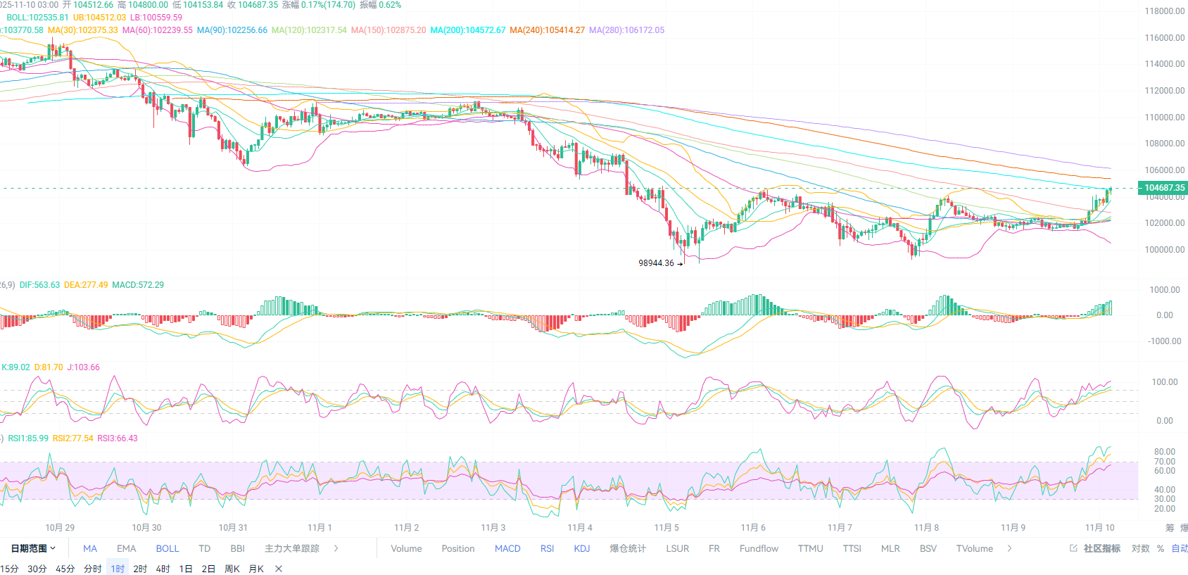 比特币现价104700附近,目前k线位于1H上轨与MA200交叉附近,昨日间红姐101500下方震荡低位多单精准布局完美触及第三目标104400,刚好k线打到1小时MA200位置,符合红姐预期的多头理想位置。继续MACD中绿柱量能强势不减,但KDJ与RSI正在高位拐头,可能存在超买向下情况,追多需谨防回踩,建议有多单可以止盈减仓继续等待回调MA150及中轨区间支撑接多!目标继续上看MA240与MA280这两个位置。