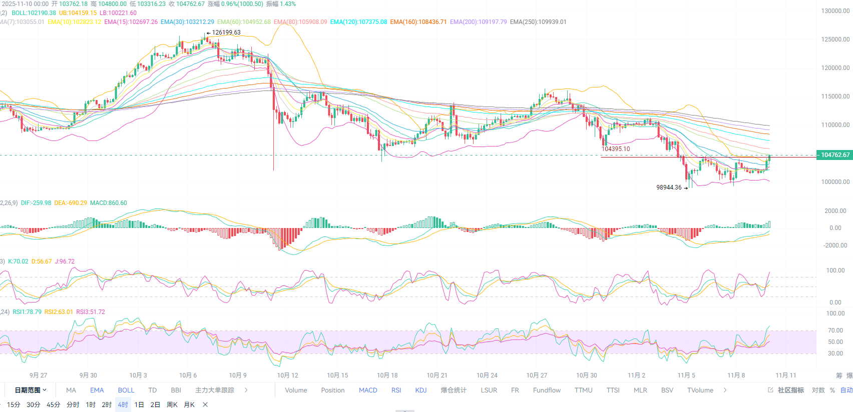 4H图中可以明显看到k线已经冲破两轮箱体高点接近EMA60位置,昨日说到的上轨位置已经被突破,那么多头空间将会得到进一步上行,日内可继续关注上方EMA60与EMA80区间能否继续破位选择高空入场,MACD中绿柱量能继续增加,DIF与DEA开口,KDJ位于95之下三线黏合还在向上扩散,RSI低于80也是三线向上发散状态,BOLL通道开口,上轨明显抬头,证明多头空间还未走完,准备薅空头的还需耐心等待!尽量保持低多为主!日内若下方EMA30(103200)再次受到支撑多头可以提前进场,不用等到1H中轨位置。