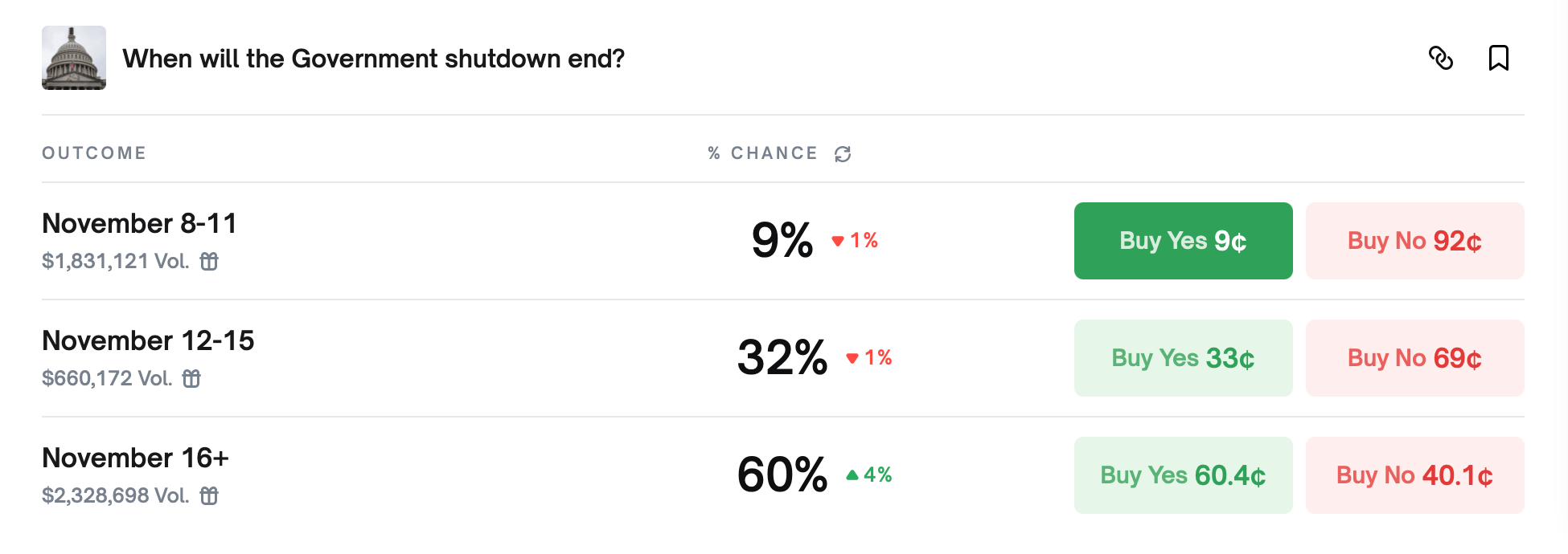 • 预测市场对停摆何时结束的看法是什么?Polymarket交易者认为停摆持续到11月16日之后的概率为60%,而Kalshi的赌徒认为停摆超过44天的概率为73%。