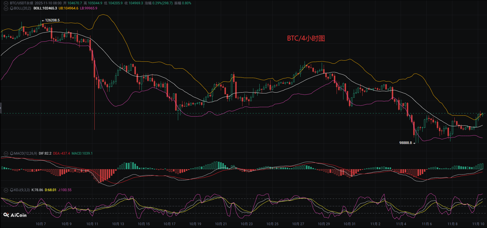 短期布林带开口姿态,走势中轨附近区域,虽然目前反弹力度有所减弱,但是上方趋势未变,且支撑在缓慢上移,日内若能企稳4小时中轴一线,后续大概率还会向上试探,所以建议思路回调多单为主。上方压制关注105000区域,下方支撑支撑关注102500位置,