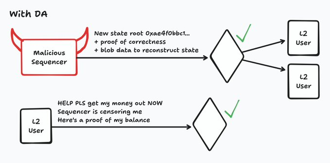 若无法访问完整状态,用户将无法强制执行提款,因为他们无法生成必要的证明。这意味着恶意排序器可能扣押用户资金或对其进行恶意阻挠。