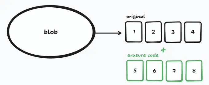 首先,blob现在采用纠删码技术。它被分成8个cell:其中4个用于存储原始blob数据,另外4个用于存储可重构数据的额外信息(这种技术称为Reed-Solomon纠删码)。