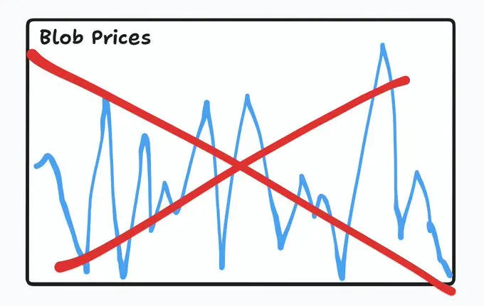当Rollup的成本主要由主网Gas费构成时,blob的价格信号机制就会失效,导致系统反复降低blob费用。这正是我们经常观察到blob费用呈现剧烈波动的原因,其价格会骤降至1 wei后又快速反弹。