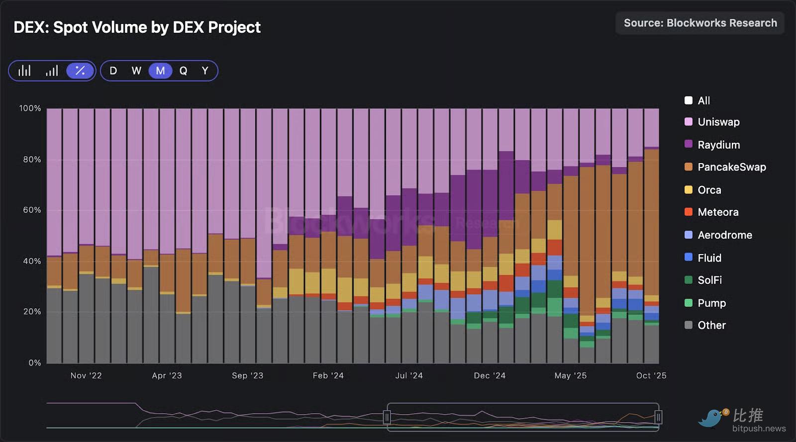 在过去的两年里,Uniswap 在 DEX(去中心化交易所)领域已经失去了其主导地位,交易量市场份额从 2023 年 10 月的超过 60% 下降到上个月的不足 15%。