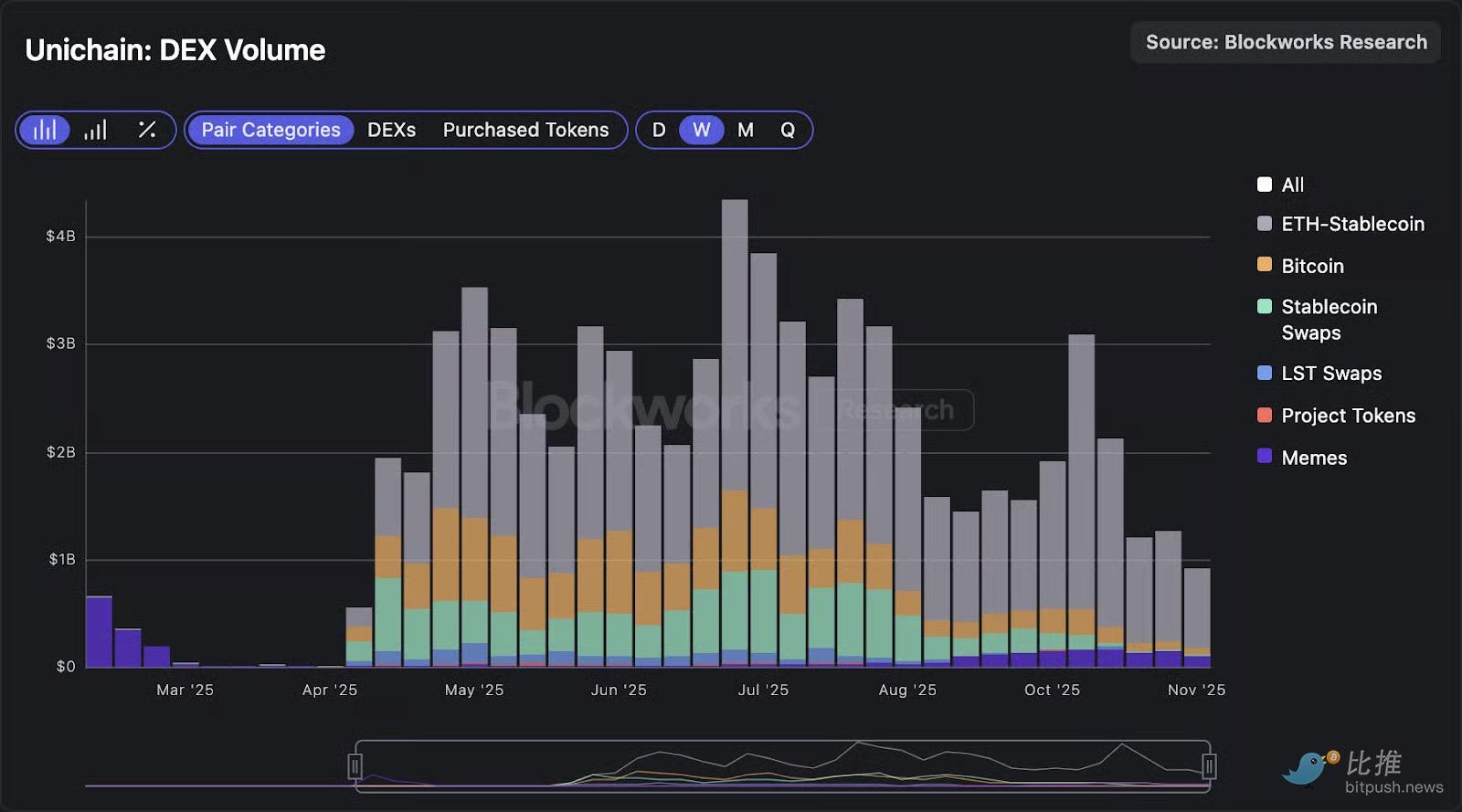 如果我们观察 Unichain,其网络活动仍然相对低迷,周度的 DEX 交易量自 7 月以来持续下降。
