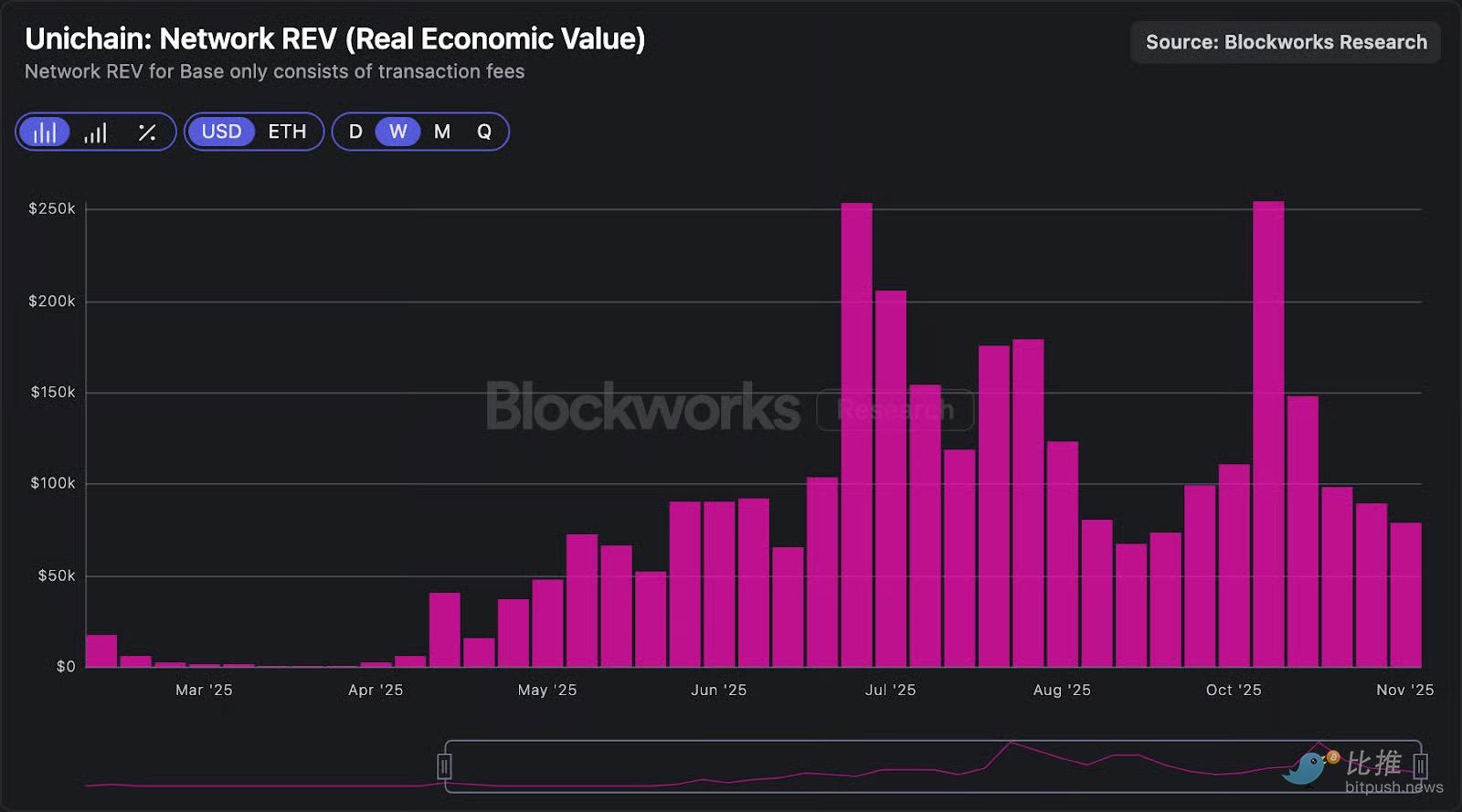在过去的 30 天里,Unichain 的网络收入总计为 46 万美元,这换算成年化收入约为 552 万美元。