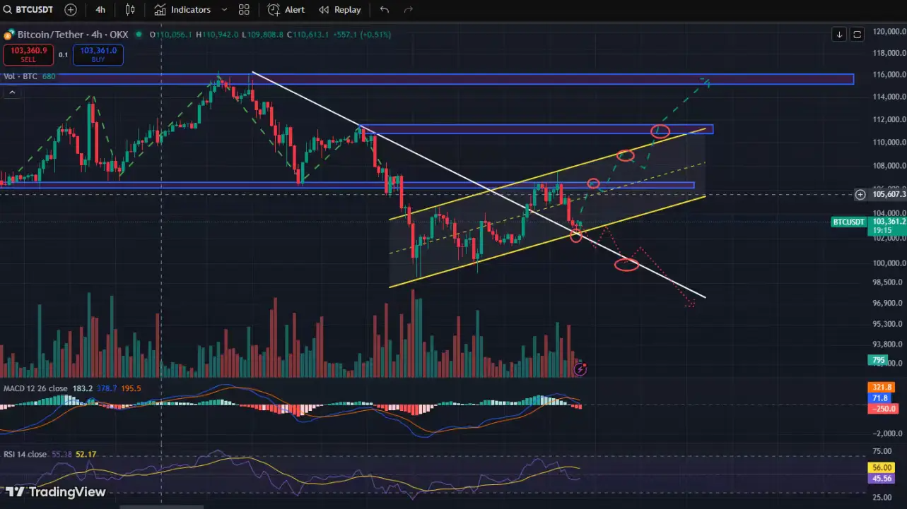 If it breaks below the lower band around $102,500, it may follow a downward flag pattern.