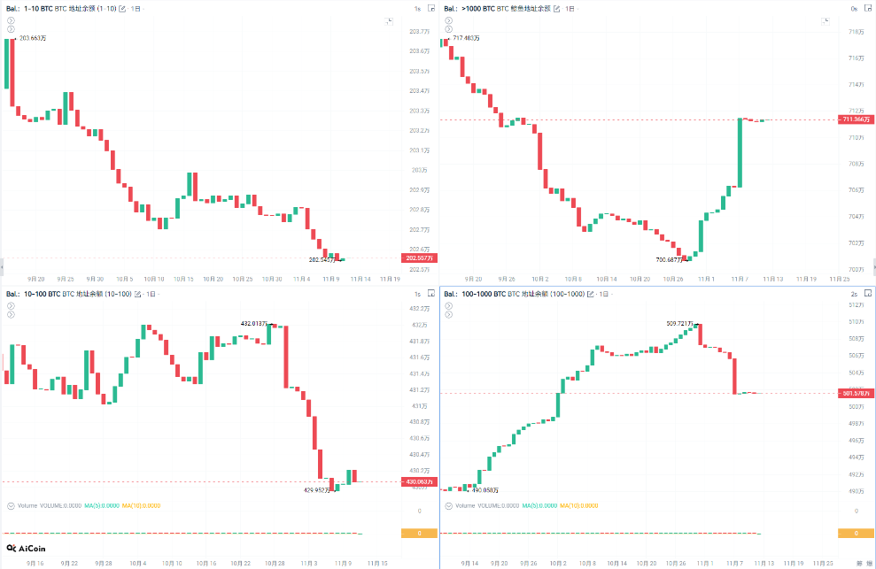 This chart shows the capital changes of BTC holding addresses of different sizes. Overall, the recent market has shown significant differentiation: