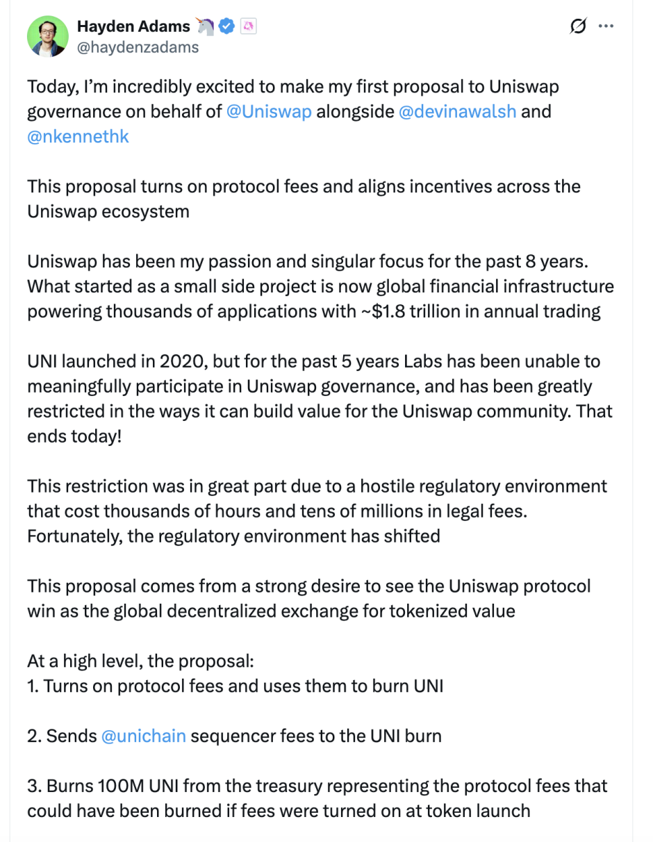 Uniswap CEO Hayden Adams recently announced his first governance proposal, which includes measures such as enabling protocol fees, burning UNI tokens, and increasing Unichain fees, shifting the UNI token towards a deflationary model. If the proposal passes, the Uniswap protocol is expected to generate approximately $460 million to $510 million annually for UNI buybacks, which will provide strong support for the token price. The specifics of the proposal are as follows: