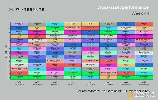 本周市场基调的转变多于方向变化。10 月份暴跌带来的冲击已基本平息,仓位也已调整完毕。尽管加密货币的表现仍然落后于其他风险资产,但整体氛围似乎不再那么脆弱。新闻头条起到了推波助澜的作用。特朗普提出的 2000 美元“刺激计划”(通过关税退税)在周末短暂提振了市场风险情绪,尽管随后被重新解读为税收减免,但它仍然达到了目的:提醒市场财政支持仍在发挥作用。此外,市场对美国政府停摆结束的希望重燃,以及宏观经济数据走软,都为交易员提供了选择性承担风险的理由。数字资产仍然是表现最差的跨资产类别,这表明市场情绪可能正在改善,但资金流动尚未跟上。