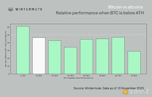 根据目前主流币的交易情况,山寨币的上涨季似乎不太可能很快到来。从历史数据来看,当主流币接近历史高点时,山寨币的表现通常较好,从而带来财富溢出效应。当比特币价格在距离历史高点 10% 到 20% 之间(目前为 16%)时,比特币跑赢山寨币的概率约为 54%。当比特币价格跌至接近 10 万美元时,根据历史数据,比特币跑赢山寨币的概率甚至会上升到约 58%。