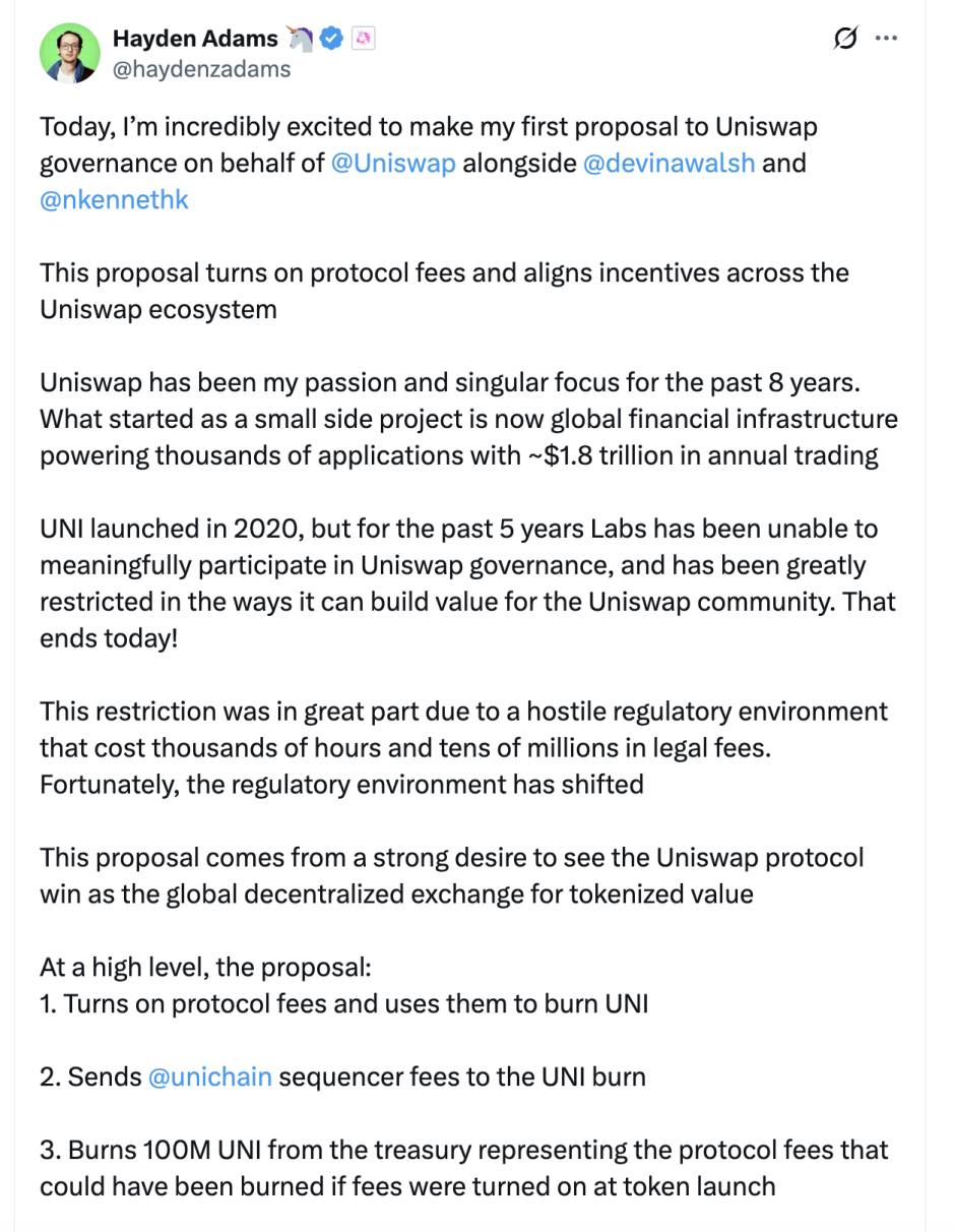 Uniswap CEO Hayden Adams近日公布了其首个治理提案,内容涉及启用协议费用、销毁UNI代币、增加Unichain费用等多项措施,使UNI代币转向通缩模型。 若提案通过,Uniswap协议预计每年将产生约4.6亿至5.1亿美元的资金用于回购UNI,此规模将成为代币价格的强大支撑。提案的内容具体如下: