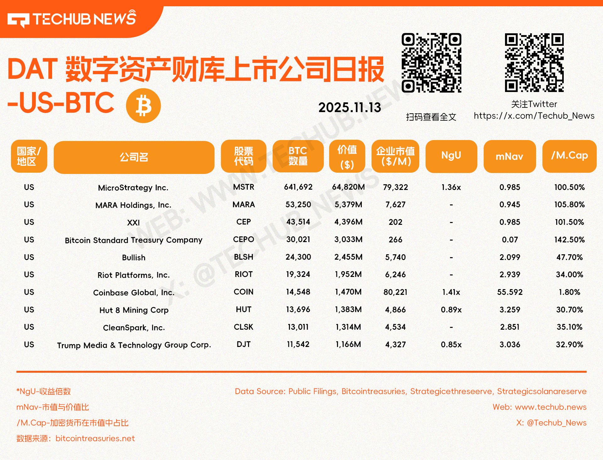 《Techub News DAT 数字资产财库上市公司日报(US-BTC・2025.11.13)》:MicroStrategy Inc. 以 641,692 枚 BTC、648.2 亿美元价值登顶;Bitcoin Standard Treasury Company 加密货币市值占比 142.50%;Coinbase 收益倍数 1.41x、mNav55.592 表现亮眼,Riot Platforms 等在 mNav 维度亦呈突出表现,展现美国上市公司 BTC 布局的多元价值格局。