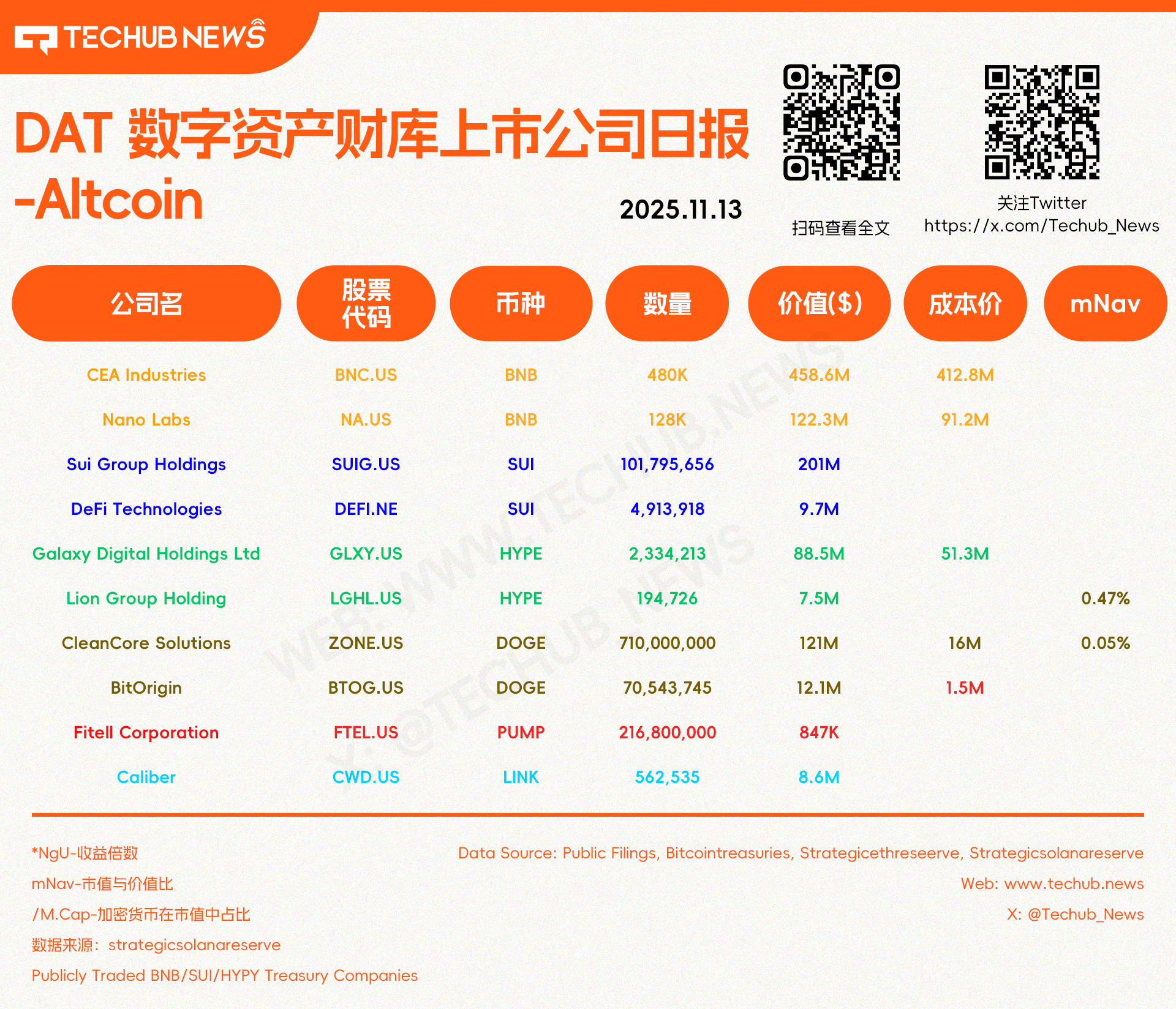 《Techub News DAT数字资产财库上市公司日报(Altcoin篇·2025.11.13)》:上市公司Altcoin布局亮点频现,CEA Industries持BNB价值4.586亿美元;BitOrigin布局DOGE成本仅150万美元,收益表现突出;Sui Group、Galaxy Digital等在SUI、HYPE领域亦有重磅持仓,多元币种布局尽显Altcoin资产在数字财库中的活力。