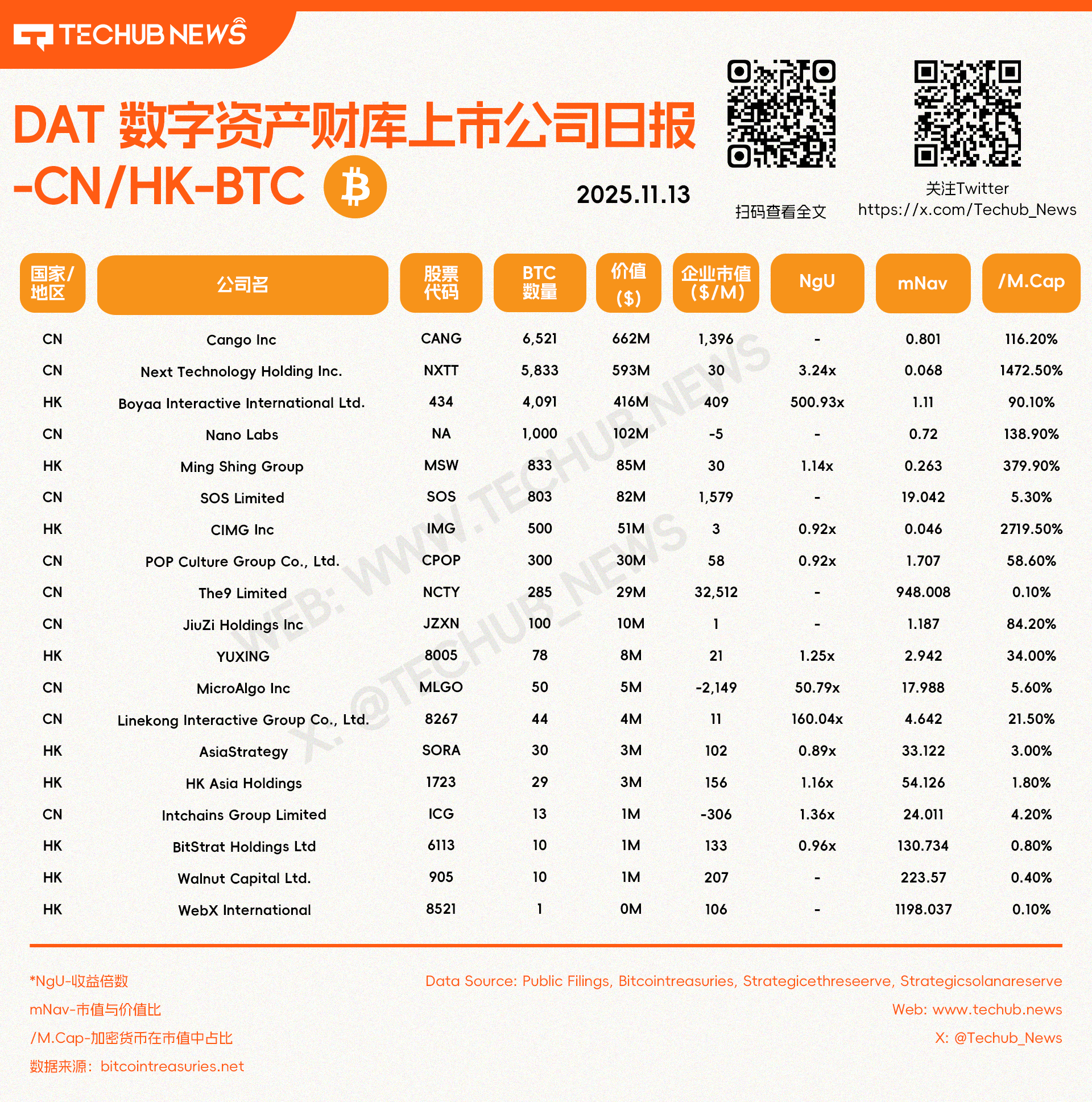 《Techub News DAT数字资产财库上市公司日报(CN/HK-BTC·2025.11.13)》:中港上市公司BTC布局亮点纷呈,Next Technology Holding Inc.收益倍数3.24x、加密货币市值占比1472.50%;Boyaa Interactive收益倍数500.93x表现惊艳;CIMG Inc市值占比2719.50%,多家企业在收益、mNav维度表现亮眼,凸显区域数字资产财库布局活力。