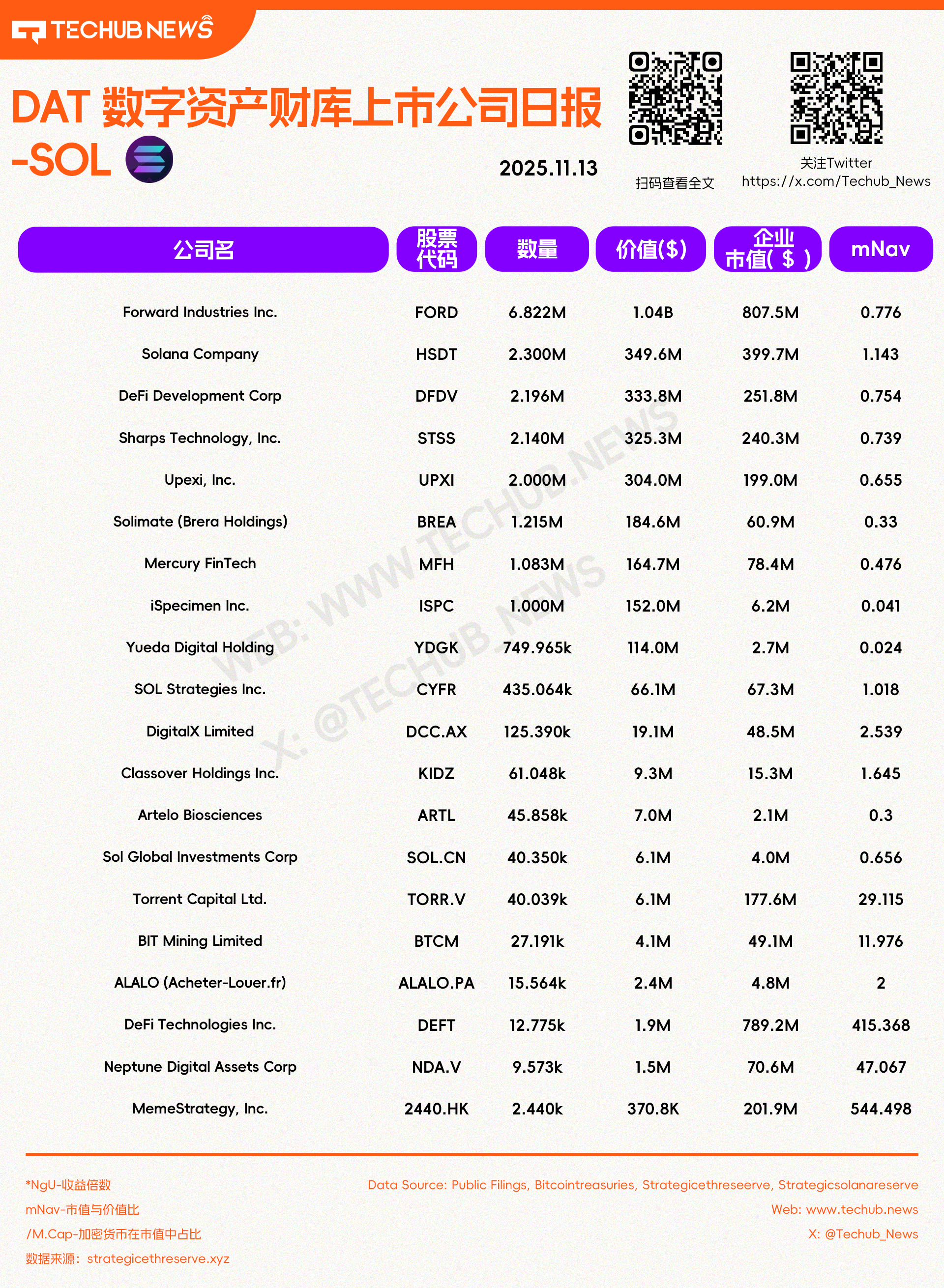 《Techub News DAT数字资产财库上市公司日报(SOL篇·2025.11.13)》:Forward Industries Inc.以682.2万枚SOL、10.4亿美元价值领跑;DeFi Technologies Inc. mNav达415.368,MemeStrategy, Inc. 突破544.498,多元企业在SOL持仓规模与市值价值比维度的布局,尽显SOL资产在数字财库中的活力。