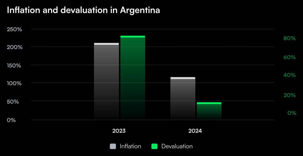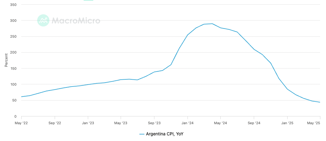 阿根廷的经济叙事始终伴随着深刻的结构性不稳定性,其本国货币阿根廷比索 (peso) 数十年来持续承受着两位数的高通胀率。这种波动性在 2024 年 4 月达到惊人峰值,通胀率同比飙升至 289.4%。尽管如此,在哈维尔·米莱总统政府实施激进经济改革(如“休克疗法”)的推动下,阿根廷通胀率与比索贬值在 2024 至 2025 年间显著回落。截至 2025 年中期,年度通胀率已大幅下降,2025 年 5 月公布的数据显示该月通胀率为 43.5%。
